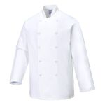 This jacket is the ultimate in wearer comfort. Made from 100% premium cotton, it is absorbent and comfortable next to the skin. The double-breasted front and rubber button features enhance the classic styling of this garment.